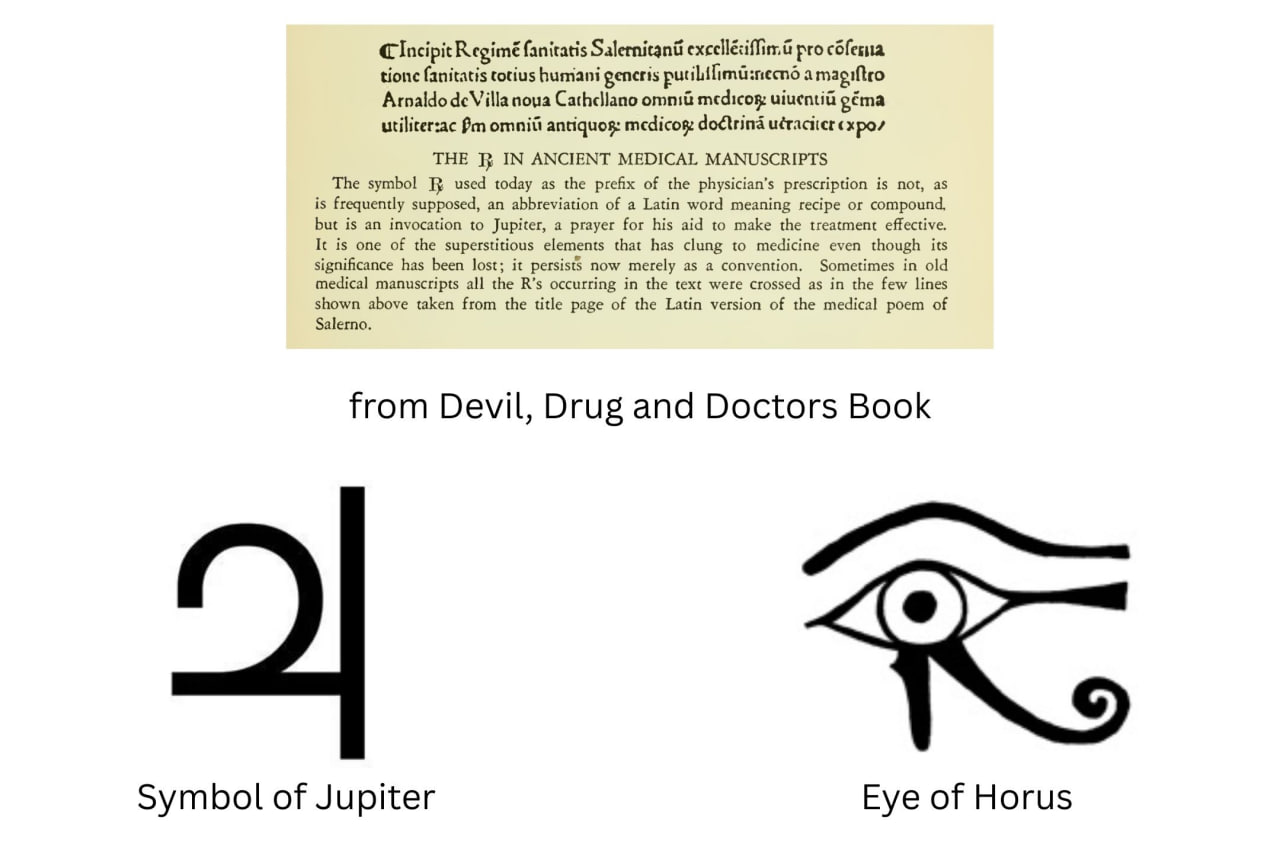 বর্তমানে চিকিৎসকের প্রেসক্রিপশনের শুরুতে ব্যবহৃত 'Rx' প্রতীকটি, যেমনটা প্রায়শই ধারণা করা হয়, 'Recipe' অর্থবহ কোনো ল্যাটিন শব্দের সংক্ষিপ্ত রূপ, বরং এটি জুপিটারের প্রতি একটি আবাহন, চিকিৎসাকে কার্যকর করার জন্য তার সাহায্য চেয়ে করা একটি প্রার্থনা। এটি কুসংস্কারমূলক উপাদানগুলোর একটি যা চিকিৎসাবিজ্ঞানের সাথে লেপ্টে আছে, যদিও এর তাৎপর্য এখন হারিয়ে গেছে; এটি এখন নিছক একটি প্রথা(Convention) হিসেবে টিকে আছে। কখনো কখনো পুরনো চিকিৎসা বিষয়ক পাণ্ডুলিপিগুলোতে লেখায় থাকা সমস্ত 'R'-এর গায়ে আড়াআড়ি দাগ কাটা থাকত, যেমনটা সালেরনোর চিকিৎসা বিষয়ক কবিতার ল্যাটিন সংস্করণের টাইটেল পেজে দেখানো হয়েছে।
